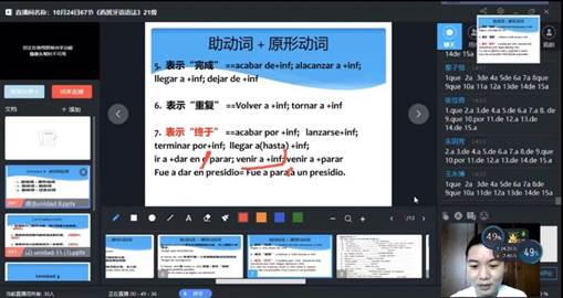 在高娅老师的课堂上,高老师备课充分,为了能让相对枯燥的语法课变得生动有趣,高老师在线上进行了随机分组比赛,让学生产生竞争意识,来更好的掌握语法知识;同时高老师在课中融入了课程思政内容,在讲解西语短语的同时对于中国和拉美文化进行对比,增加学生民族自信。在外教老师Valeria的会话课堂上,课堂氛围轻松、有趣,学生敢于表达,能够很好的进行西班牙语输出,而且外教老师非常积极的对学生的发音进行纠正,使学生更好的掌握地道的西班牙语。
