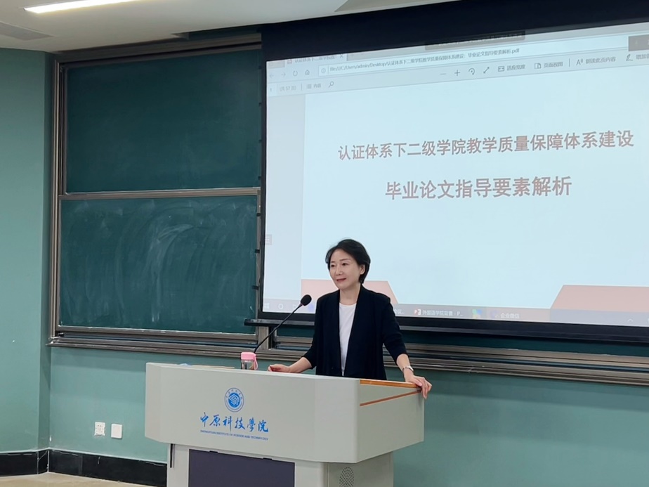 为进一步提升本科毕业论文质量,强化师范认证背景下二级学院教学质量保障体系建设,2025年4月10日,外国语学院邀请黄怡俐教授在许昌校区立业楼S210开展“基于认证体系下二级学院教学质量保障体系建设——毕业论文指导要素解析”专题讲座,会议由外国语学院副院长李莉主持,郑州校区线上连线、线下集中观摩。