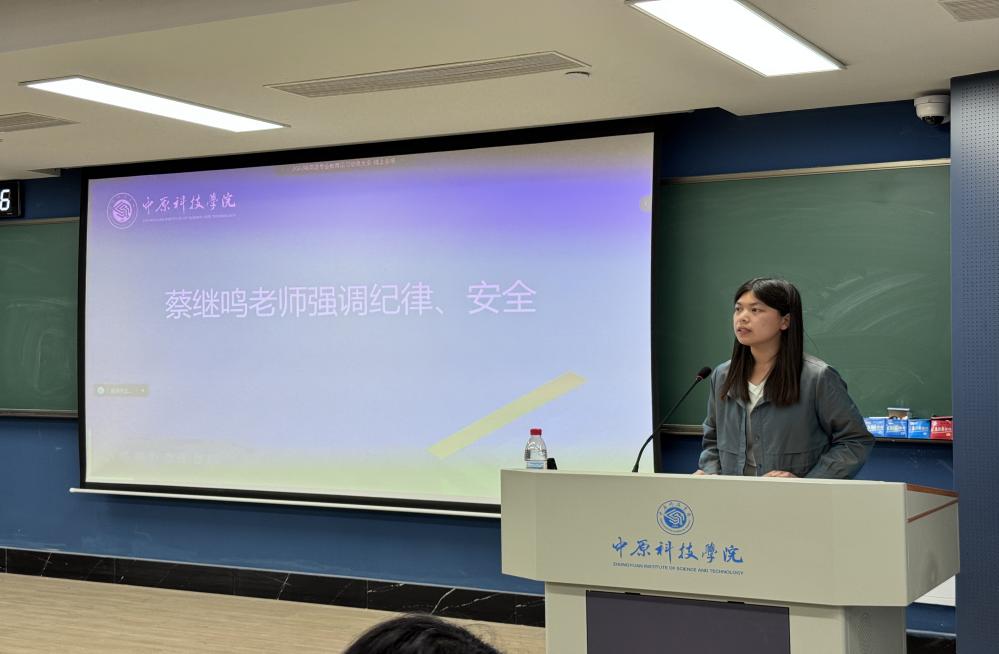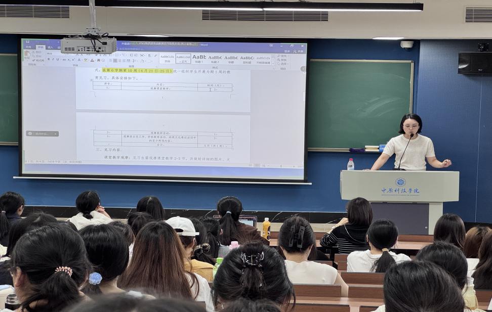 随后,王晓庆老师详细讲解了本次教育见习的具体安排,包括见习时间、地点、任务要求及考核标准。王老师指出,教育见习是师范生培养的重要环节,对于提升同学们的专业技能和实践应用能力有着不可替代的作用,希望同学们珍惜实践机会,服从指导老师和见习单位的安排,认真学习,将理论知识与教学实践相结合、在既定岗位上学习锻炼。为保障见习活动的规范性,王老师着重强调所有学生在见习期间不得随意调动。为维持见习活动的正常秩序,确保教学实践的连贯性,辅导员蔡继鸣老师围绕纪律与安全两方面提出明确要求,提醒同学们在往返见习学校及教学过程中务必注意人身安全、交通安全、财产安全、饮食安全及课堂管理安全,严格遵守见习学校的规章制度,展现外国语学院学子的良好风貌。