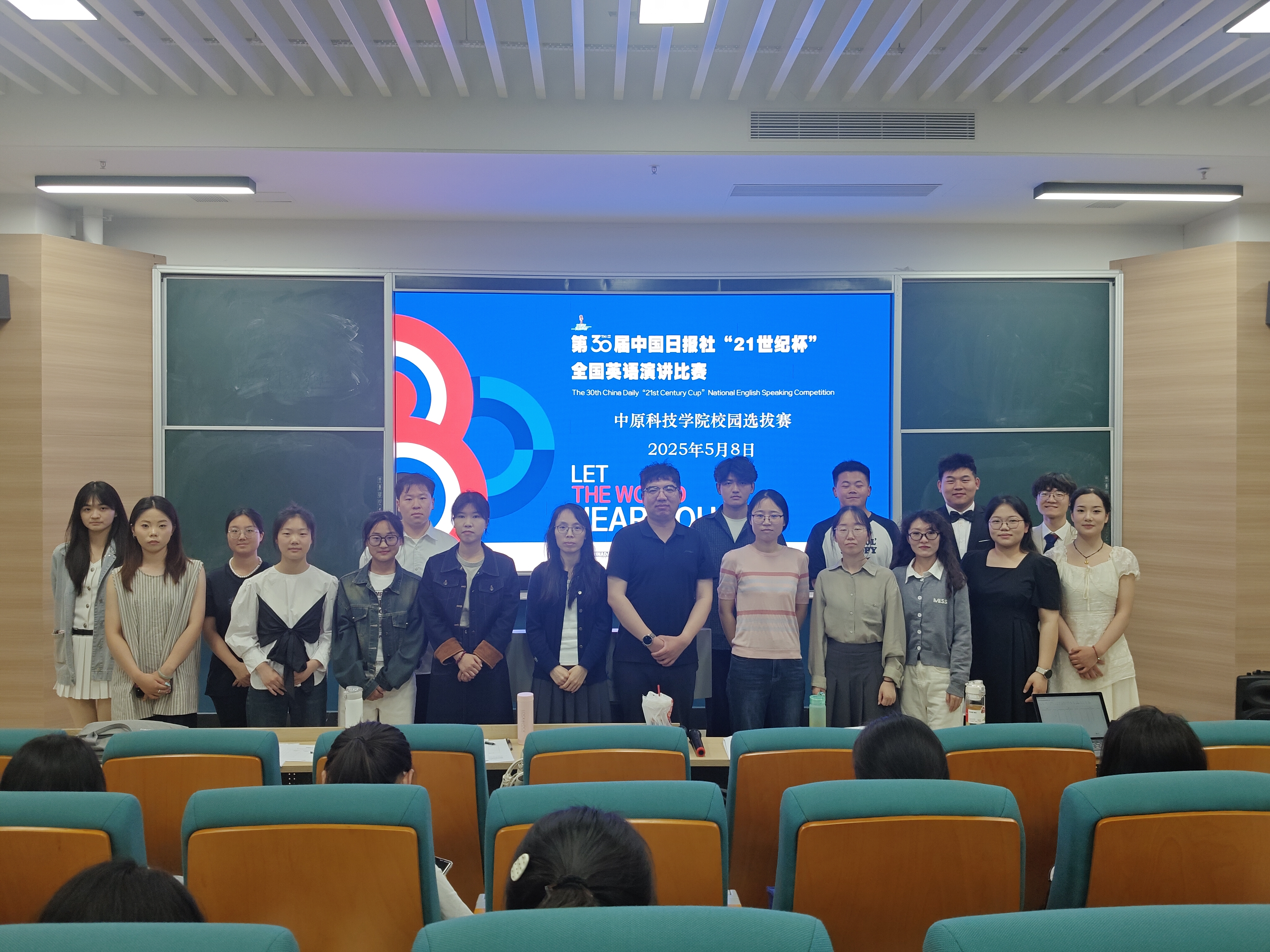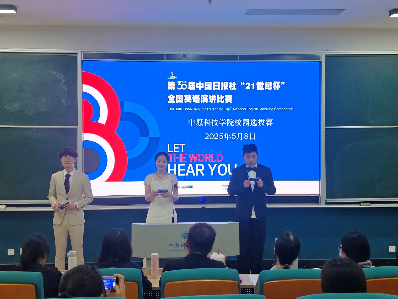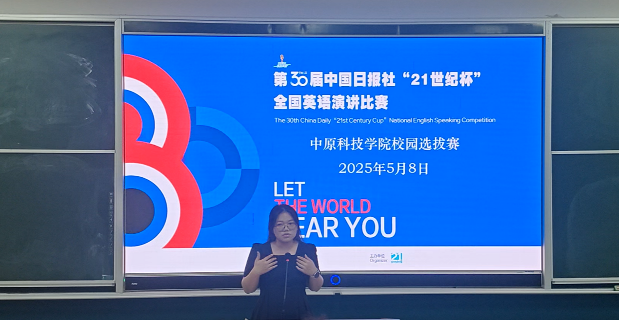 2025年5月8日,由中原科技学院外国语学院承办的第30届中国日报社"21世纪杯"全国英语演讲比赛校级选拔赛在协作报告厅圆满落幕。经过层层选拔的10名各专业学子同台竞技,以卓越的英语素养与思辨能力,呈现了一场展现当代青年国际视野的视听盛宴。