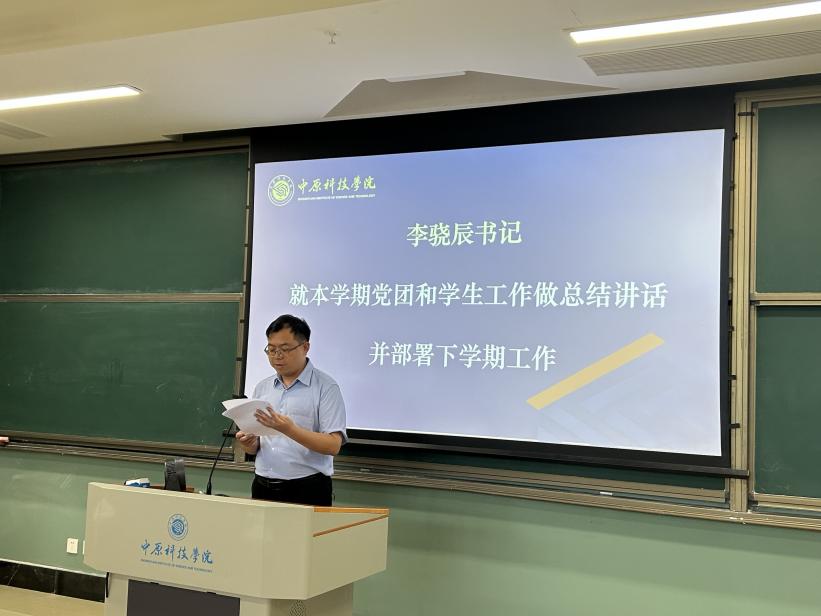 外国语学院副院长兼党总支书记李骁辰总结了本学期党团与学生工作、在校生及毕业生就业情况,并强调了暑期留校学生管理与就业推进工作。