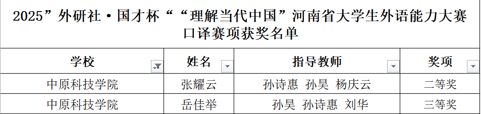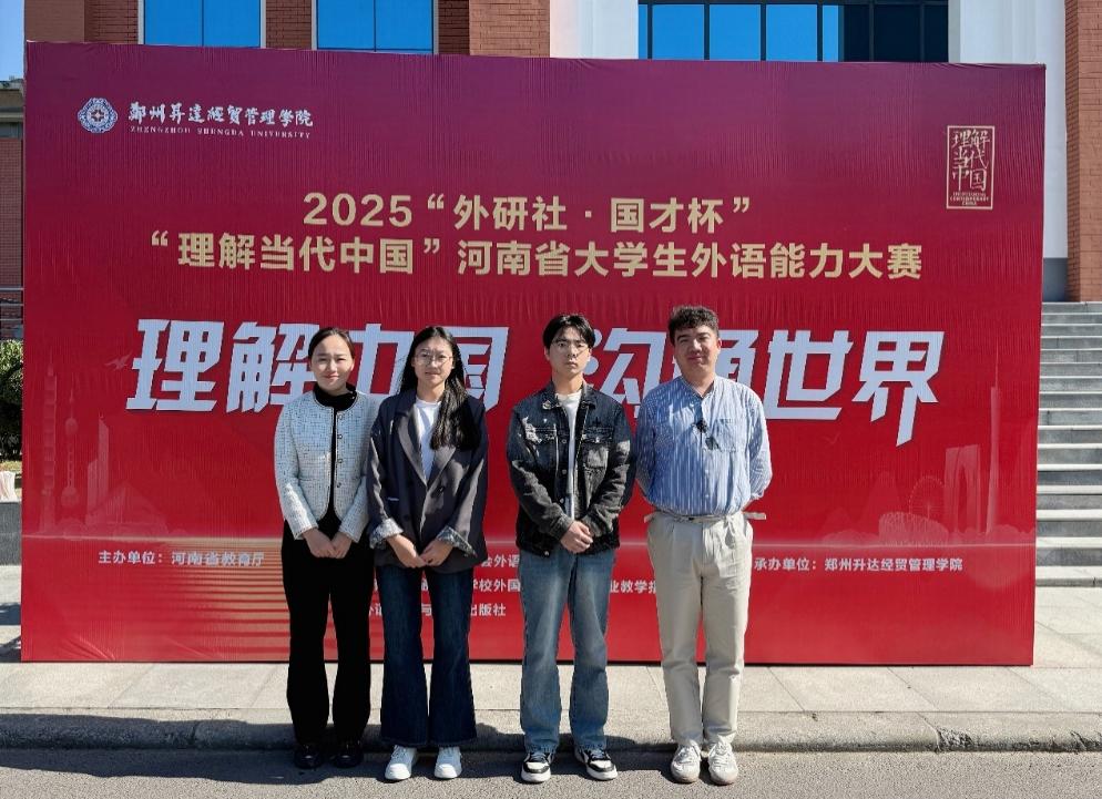 2025年11月1日,2025“外研社·国才杯”“理解当代中国”河南省大学生外语能力大赛(口译赛项)在郑州升达经贸管理学院成功举行。外国语学院2023级英语专业张耀云、2022级商务英语专业岳佳举在商务英语教研室教师孙诗惠、孙昊带领下参加了此次比赛。经过激烈角逐,张耀云同学获得省赛二等奖、岳佳举同学获得省赛三等奖,创下了我院学子在该项赛事的口译赛项省赛上的最佳成绩,实现了我校在口译省级赛事中获奖零的突破,具有里程碑意义。