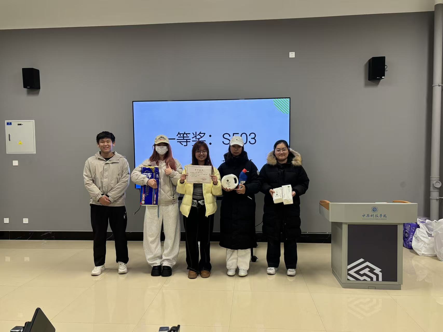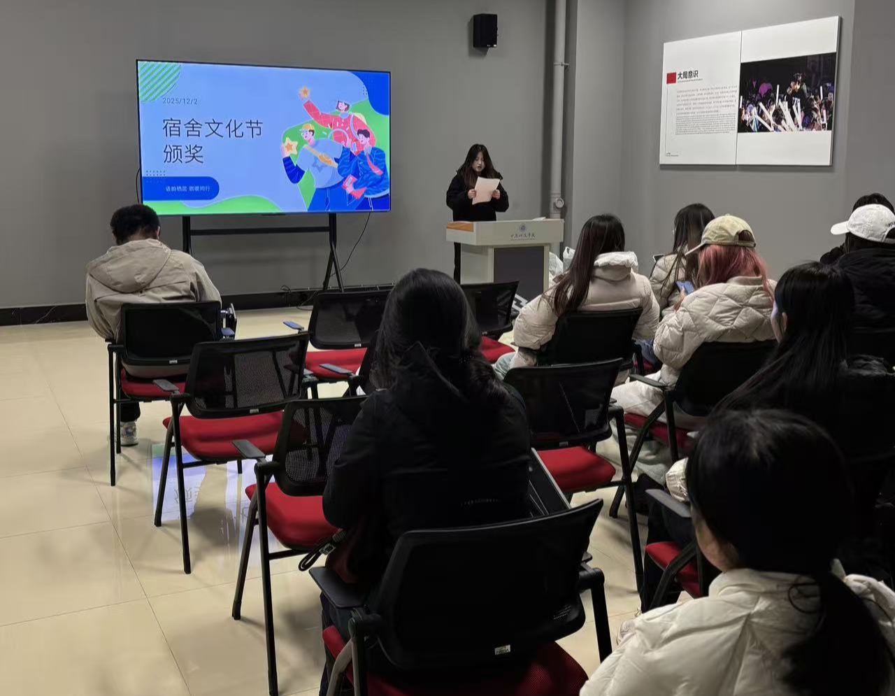 生活权益部负责人张凌赫受老师委托致辞,宣布了本次文化节的获奖名单,并为获奖宿舍颁发荣誉证书。他对获奖宿舍整洁的环境和和睦的氛围给予了高度评价,同时鼓励大家继续保持良好习惯,共同建设舒适、温馨的宿舍家园。
