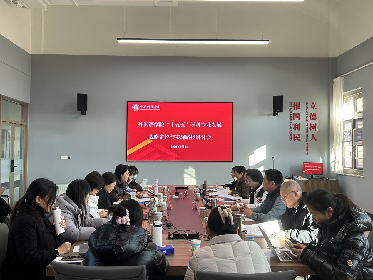外国语学院召开“十五五”学科专业发展战略研讨会2026年1月9日,中原科技学院外国语学院在许昌校区中兴楼M317召开“十五五”学科专业发展战略定位与实施路径研讨会。会议由外国语学院院长赵妤主持,院部领导黄怡俐、李莉、刘华、郭芬;论证专家姜士