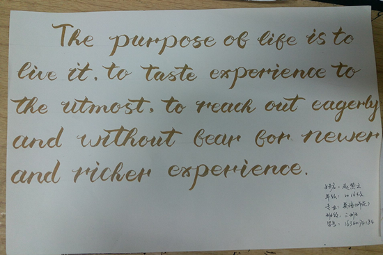 为提高大学生书法水平,培养促进学生的全面发展,丰富校园文化生活,加强文化交流。河南师范大学新联学院外国语学院宣传部特意举办以“外文书法大赛”为主题的校园活动。全体同学从11月4日到11月9日下午六点踊跃参与,积极展现自己的才华。