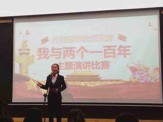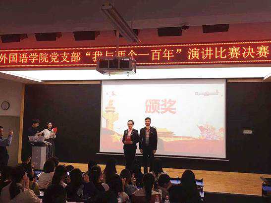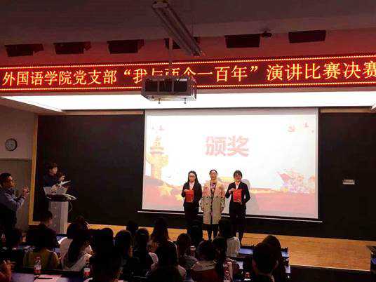 为深入学习宣传贯彻习近平新时代中国特色社会主义思想和党的十九大精神,持续贯彻落实全国全省高校思想政治工作会议精神,着力推动我校广大师生为“两个一百年”奋斗目标贡献力量,10月17日下午,由我校外国语学院党支部举办的“我与两个一百年”决赛在文职楼113举办,外国语学院副院长、分工会主席胡杰、公共教学部副主任陈菁出席本次大赛。