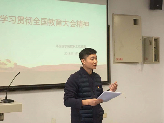 为深入贯彻习近平新时代中国特色社会主义思想和党的十九大精神,深入贯彻落实全国教育大会精神,扎实推进《中共中央国务院关于全面深化新时代教师队伍建设改革的意见》的实施,进一步加强师德师风建设,11月27日,外国语学院教职工党支部在日新楼308召开全国教育大会精神学习会。