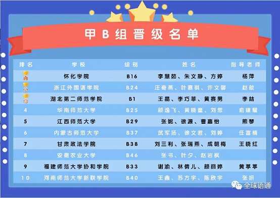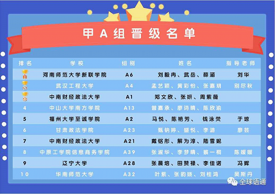 5月10日,2018“语通杯”全国大学生职场与商务英语沟通技能大赛复赛圆满结束,我校外国语学院荣获佳绩,外国语学院刘华老师指导的参赛学生刘毅冉、武岳、薛涵荣获甲A组全国第一名,张妍老师指导的参赛学生王鑫、苏方宇、陈欣宇荣获甲B组全国第十名(甲A组难度、广度略高于甲B组),成功晋级全国总决赛!
