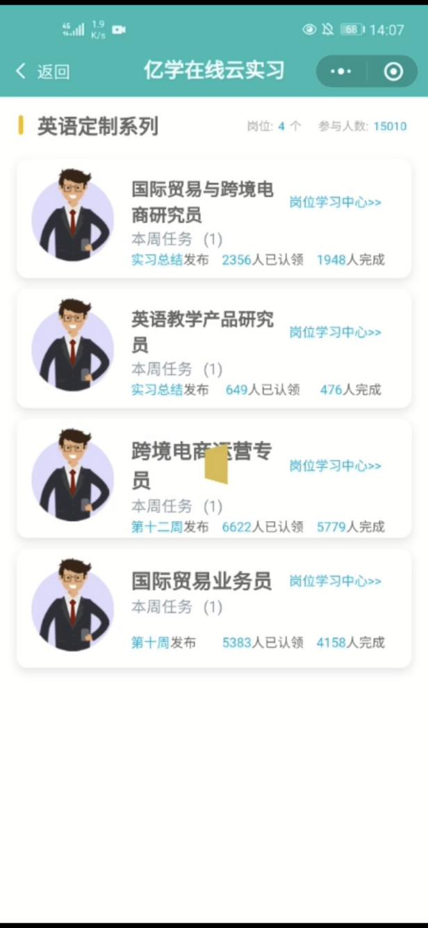 本次专业实习是我院商务英语专业与福建亿学教育科技集团有限公司合作,针对疫情防控特殊时期,共同开展的新型实习方式---“云实习”。“云实习”依托亿学在线云实习平台,亿学企业导师,采用PC端和移动端双端开放的模式,同时学院专业学科资深老师远程指导,使学生足不出户就可以在家参与实习。