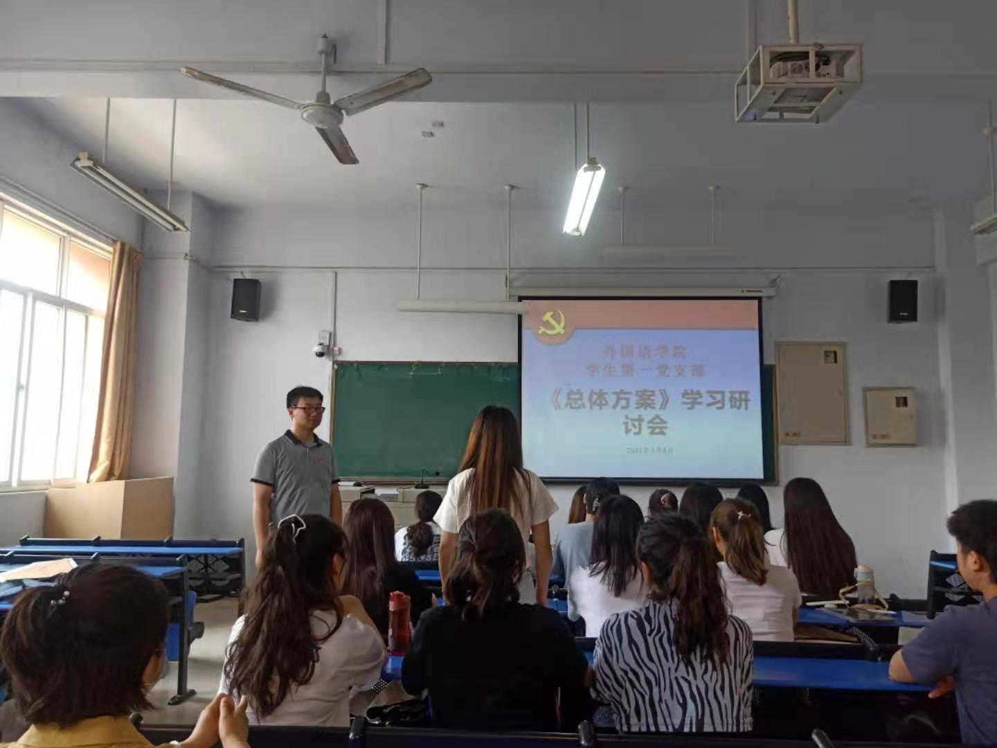 根据河南省教育厅关于推进落实《深化新时代教育评价改革总体方案》工作的通知要求,为进一步深入学习《深化新时代教育评价改革总体方案》,贯彻落实文件精神,2021年5月8日外国语学院学生第一党支部在日新楼310举办了《总体方案》学习研讨会。党支部书记刘琦老师以及党支部内所有党员参加了本次研讨会,并围绕学校相关工作进行交流研讨。