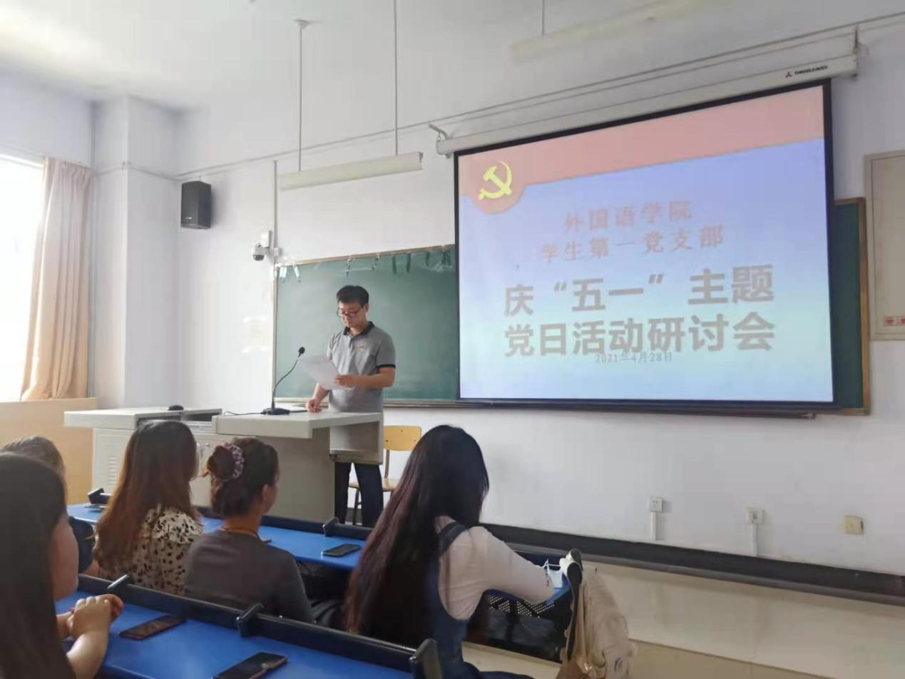 值此五一国际劳动节来临之际,为深入学习贯彻习近平总书记系列重要讲话精神,全面提升基层党建工作制度化、规范化水平,进一步严肃政治纪律和政治规矩,推动全面从严治党要求落地落实。外国语学院学生第一党支部于2021年4月28日在日新310开展了“庆五一”主题党日活动研讨会。