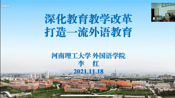 2021年11月18日晚7点30分,中原科技学院外国语学院通过腾讯会议平台举办了“深化教育教学改革,打造一流外语教育”线上学术讲座。本次讲座邀请河南理工大学外国语学院副院长、河南省日语教学研究会会长、河南省外国语言文学类教学指导委员会委员李红教授主讲,校长助理兼外国语学院副院长赵妤主持,外国语学院全体教师聆听了讲座。