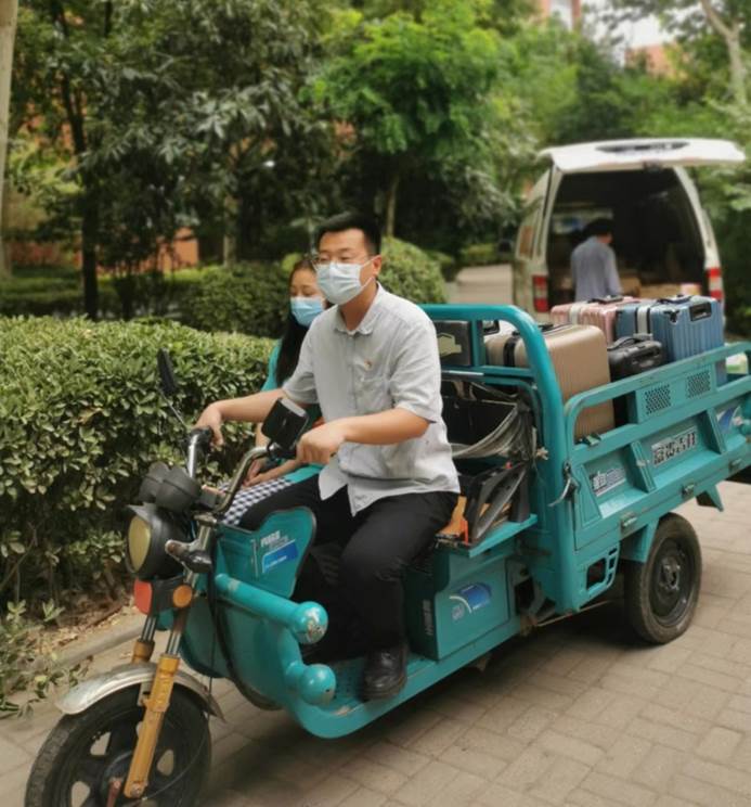 志愿者们细致负责地帮助学生进行手续办理等工作,在考验基层党组织凝聚力的关键时刻,主动担当作为。为了解决学生搬行李的实际困难,志愿者把关心付诸行动,开展“多对一”服务,化身“最美搬运工”,汗流浃背从五楼、六楼帮助学生搬运行李下楼十几趟,帮学生将行李运到寄送点或者校门口。同时,学院为了帮助广大学生安全平稳、快捷有序地到达车站地铁站,专门成立教工党员爱心车队,为广大学子提供免费送站服务,十余辆爱心车马不停蹄地在各车站、学校校区之间来回穿梭,还有教师开着私家车全程参与。