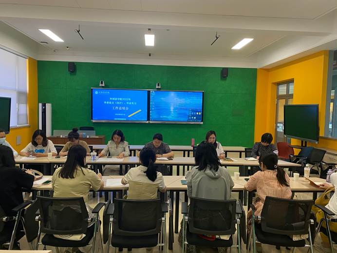 2022年6月1日下午4:30,外国语学院在日省楼N326召开2022届毕业论文(设计)、毕业实习工作总结会。校长助理兼外国语学院副院长赵妤、院长助理李莉、刘华,各专业教研室主任以及各专业毕业论文(设计)、毕业实习工作负责人参加了此次总结会,总结会由院长助理李莉主持。