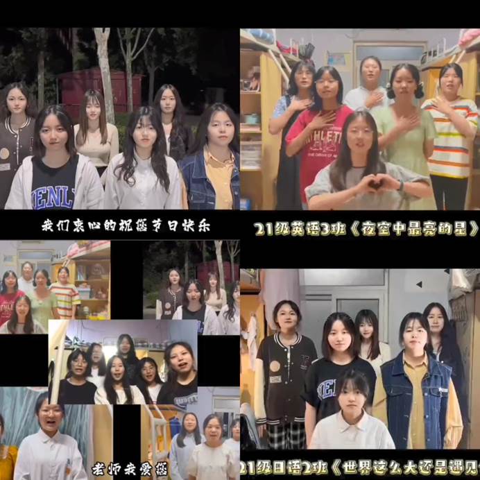 本次活动共分为云端歌会和颁发小礼品两个环节。学生们以宿舍为单位参与云端歌会,并由学生代表发言表达了对老师的问候和祝福,最后,不同专业的学生分别以英语、日语、西班牙语、德语、汉语表达了对老师的感恩。一段段动情的歌声,一句句温暖的话语,让老师们欣然欢喜、感动不已!在同学们的声声祝福之后,外国语学院党总支书记马鹏辉老师、院长助理刘华老师和办公室主任任娇品老师为各位老师颁发了小礼品。