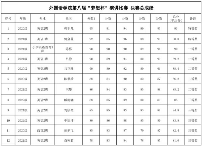 本次比赛前后历时一个多月,经过初赛、复赛层层选拔,此次决赛共有12名同学晋级,比赛过程中选手们激情澎湃、条理清晰、表现出色。比赛结束,大赛评委进行总结点评,肯定了选手们扎实的英语功底、敏捷的思维能力及深厚的知识积累,并传授相应的演讲技巧,希望选手们不断超越自我,赢得佳绩。本次比赛共评选出特等奖两名,一等奖两名,二等奖三名,三等奖五名,特等奖获得者蒋非凡同学、何金蔓同学将代表我校参加“外研社•国才杯”演讲比赛省级决赛。