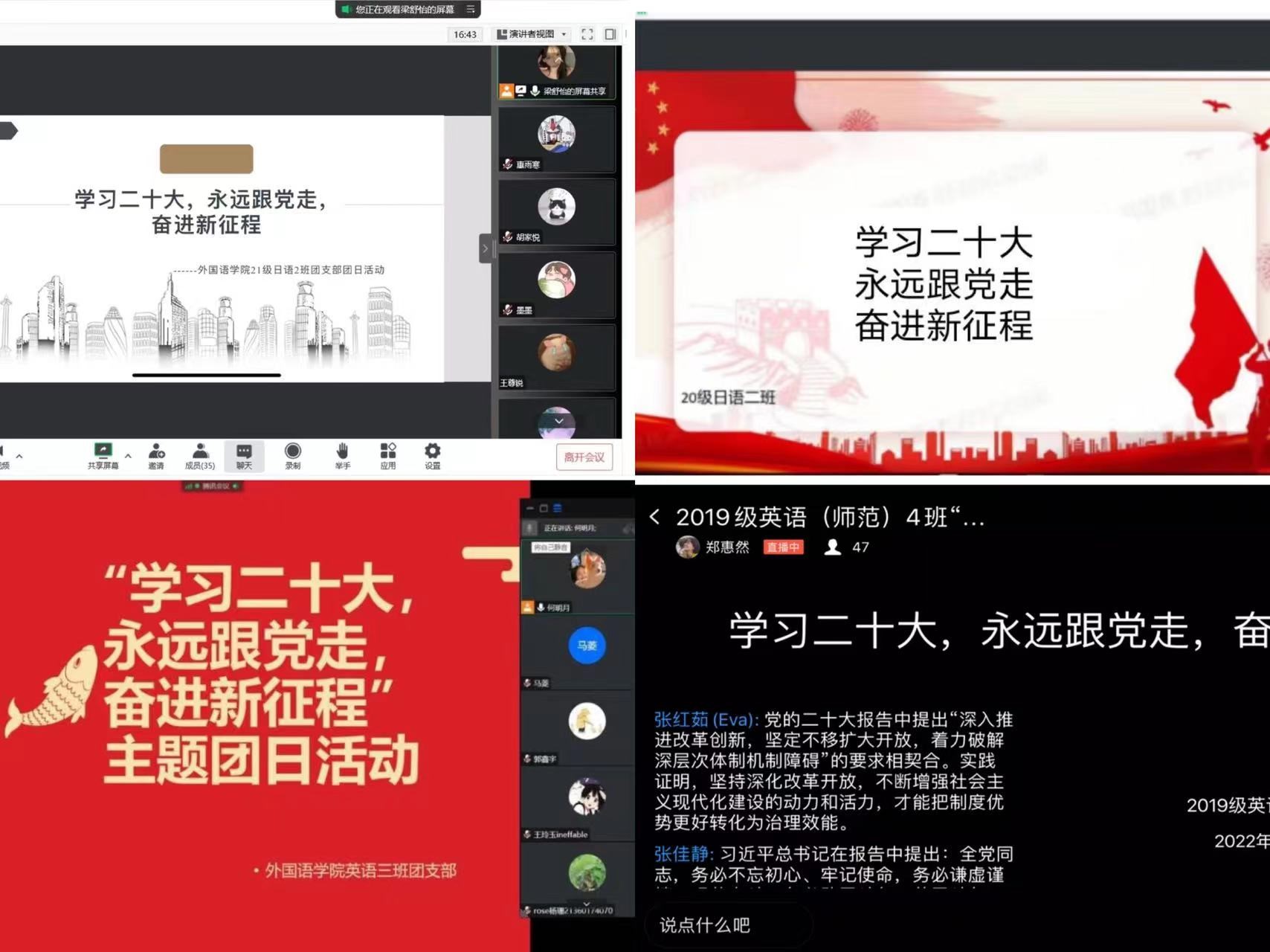 明确本次团日活动工作要求后,外国语学院各支部于11月15日-11月18日期间召开了“学习二十大,永远跟党走,奋进新征程”主题团日活动。本次团日活动主要通过许昌校区线下集中学习和郑州校区线上视频学习相结合的方式组织开展,在团支书及其他团干的带领下,各支部通过召开主题班会、征文比赛、支部成员演讲等方式带领支部成员学习了“二十大”相关内容。主要流程如下: