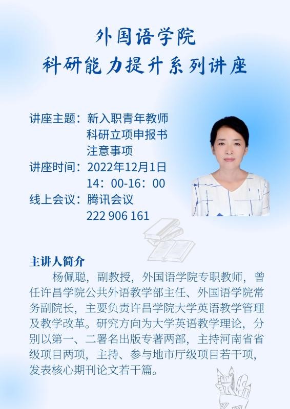 12月1日下午,外国语学院专家教师、大学英语教学管理及教学改革负责人、省级项目主持人杨佩聪副教授受邀开展关于“中原科技学院外国语学院科研能力提升”系列讲座之“新入职青年教师科研立项申报书注意事项”。本次讲座在腾讯会议举办,院长助理刘华主持,外国语学院全体教师以线上的形式聆听了此次讲座。