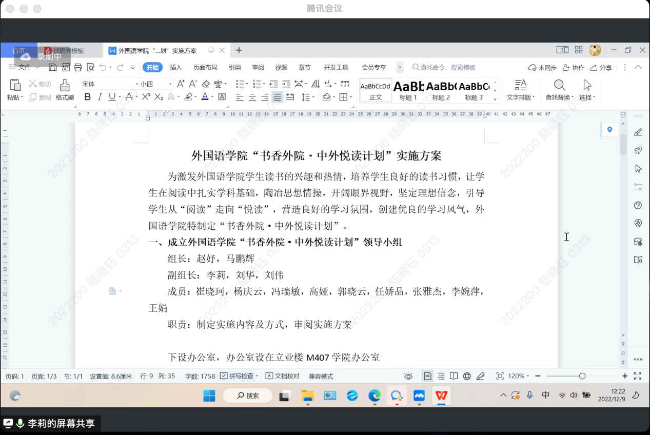 为激发外国语学院学生的读书热情,培养学生良好的读书习惯,营造浓厚的读书氛围,外国语学院制定了“书香外院·中外悦读计划”,并于12月9日上午召开了线上启动会,院长助理李莉主持会议。本次参会的人员主要有:院长助理刘华、办公室主任任娇品、团委书记刘伟、2022级本、专科辅导员、2022级本科班级导师、2022级专科《综合英语》《综合商务英语》任课教师、以及全体2022级本、专科学生。