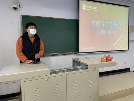 为帮助2020级学子早日明确考研目标,了解国内外考研的最新信息与动向,进行科学有效的备考,3月2日上午,外国语学院日语教研室在日新楼508举办了2020级日语专业考研分享交流会。参加此次考研分享交流会的有:2020级日语专业辅导员付星老师,日语教研室冯瑞敏老师、刘强老师,15级成功考研上岸的学生代表鲁艺男同学以及全体2020级日语专业学生。
