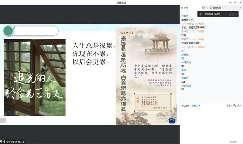 除了专业学习之外,李好洁同学建议学弟学妹们多参加一些英语比赛,积极展现自己的能力,在比赛中获得收获和不足,在以后的学习道路上走得更远;多考级考证,如英语四六级,专业四级,专业八级,在以后的求职过程中更加重要。22级学弟学妹们积极踊跃提问咨询一些有关学习和生活上的问题,李好洁同学悉心解答他们的疑惑,在相互探讨中促进交流,同时她也鼓励大家多参加一些课外活动丰富大学生活,让大学生活更加充实,做到德智体美劳全面发展。最后李好洁鼓励22级学弟学妹们努力学习,不要虚度青春。