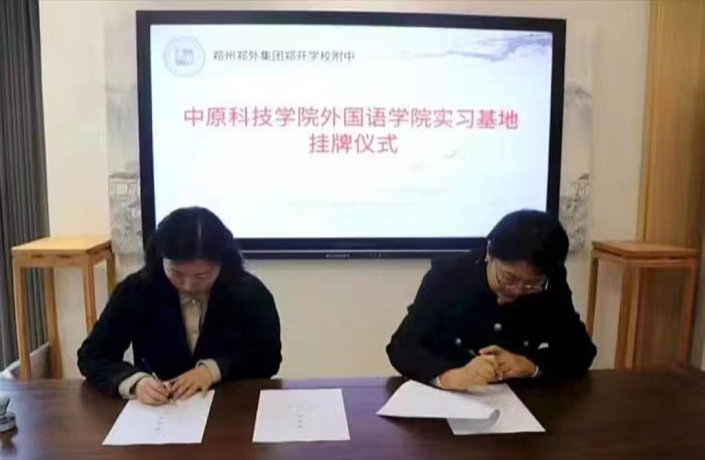 2023年3月31日下午,“中原科技学院外国语学院实习基地”挂牌签约仪式在郑州郑外集团郑开学校附中举行。中原科技学院校长助理兼外国语学院副院长赵妤、外国语学院院长助理刘华、英语语言学与文学教研室主任崔晓珂、外语学科教学教研室主任闫瑞琼、商务英语与翻译教研室骨干教师李小丽出席了仪式。