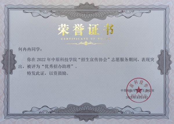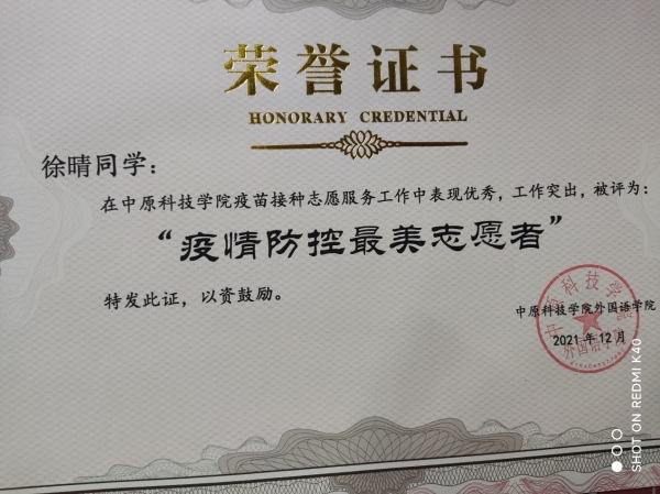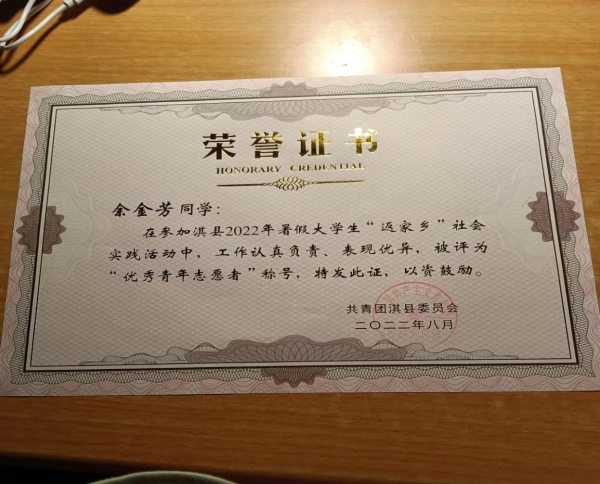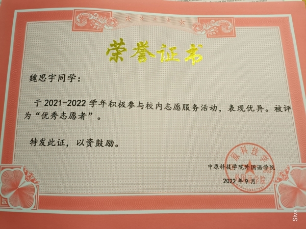 商英一班共有23名同学获得不同类型的志愿者证书,例如以下同学。