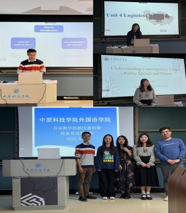 2023年9月28日下午2点,外国语学院商务英语教研室分别在日新楼304(郑州校区)和立业楼S202(许昌校区)同时举行了中原科技学院外国语学院“教学技能大赛”教研室选拔赛。此次比赛共有谢波、李慧慧、邓明洋、刘文静、张薇、孙诗惠和周静丹七位教师参赛。本次大赛由教研室主任杨庆云主持,由教研室副主任燕董娇进行点评,赛后教研室所有老师进行了线上加线下研讨和总结交流。