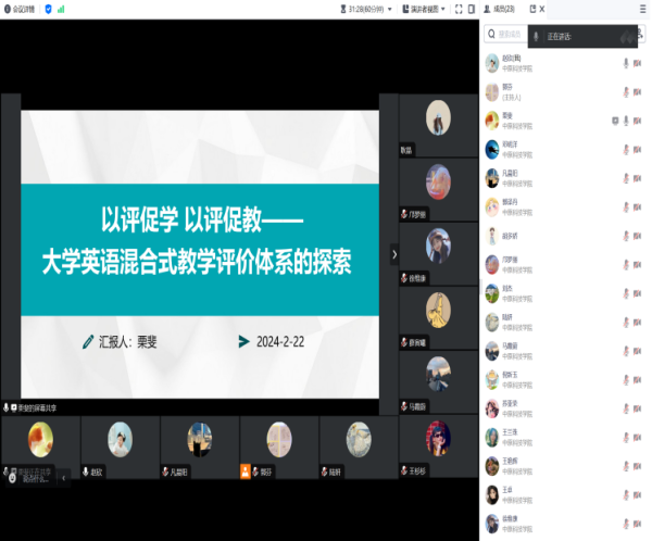 2024年2月22日,外国语学院大学英语第一、第二教研室以线上腾讯会议的方式举行了新学期的第一次教研主题分享活动,第一、第二教研室全体教师参会。本次会议分享的教师为栗斐老师与凡晨阳老师,主题分别是“以评促学,以评促教——大学英语混合式教学评价体系的探索”“SPOC教学模式在大学英语阅读中的实践与应用”。
