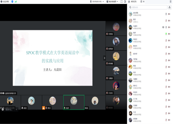 凡晨阳老师先与大家分享了SPOC教学模式在大学英语阅读中的实践和应用:分别从SPOC教学模式概述、SPOC教学模式下阅读课堂的构建、教学结果分析和总结四个部分进行分享。在阅读课堂的构建方面谈及到课前准备阶段、课中实施阶段和课后巩固阶段的课堂实践中SOPC教学模式具有很强的应用价值。并在最后进行总结,SOPC教学模式打破了传统课堂单一的教学模式,弥补了现行教材更新慢的缺憾,学生提高了学习效率,成绩显著提升。