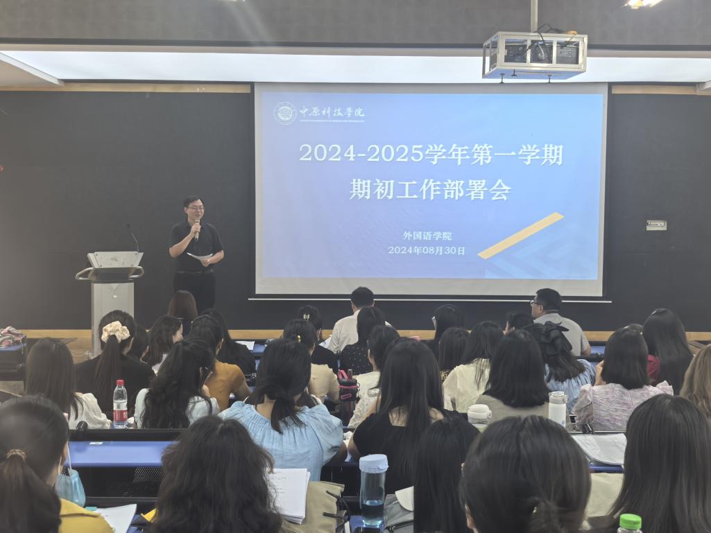 为保障开学初学院各项工作平稳有序,8月30日上午9:00,外国语学院在郑州校区文质楼113举行2024-2025学年第一学期期初工作部署会议。学院领导及全体教职工参加了本次会议,会议由外国语学院副院长李莉主持。