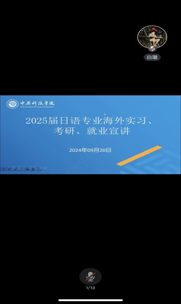 为帮助2025届毕业生搭建一个了解海外实习机会、考研路径及就业前景的平台,助力他们规划未来,明确方向,9月20日晚,外国语学院日语教研室举办了海外实习、考研与就业宣讲会。郑州和风优途文化传播有限公司戚老师,日语教研室冯瑞敏老师、卢静老师、白璐老师以及2021级日语专业全体学生共同参加了此次会议。