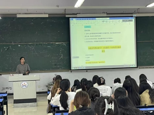何梦丽老师重点阐释了翻译方向的选题要求和论文框架,强调选题须确保研究对象的具体化,如文本中特定语言现象的翻译,指出应注重将翻译理论与所研究文本相结合,在所定研究对象的基础上选择合适的翻译理论,同时注意选题的创新。