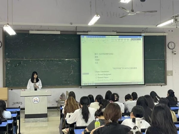 会议中,不同选题方向的五位指导教师分别围绕各自的专业领域,为同学们提供了深入的选题指导,也就论文的框架进行了详细的阐述,给同学们提出了明确且系统的要求。周佳雯老师讲解了教学方向选题要求和论文框架,指出选题应围绕当前外语教学热点与实际需求,选择新颖议题,同时鼓励同学们结合校外实习开展实证研究,通过问卷调查、师生访谈等方式获取调研资料。