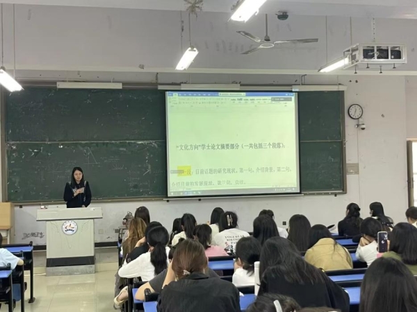 王现锐老师针对文化方向选题要求和论文框架进行了说明,强调选题要体现跨文化视野,关注不同文化间的交流、碰撞、融合以及文化在语言中的体现,或是关注文化在全球化进程中的发展趋势,鼓励同学们从文化产业、文化传播等方面选题。