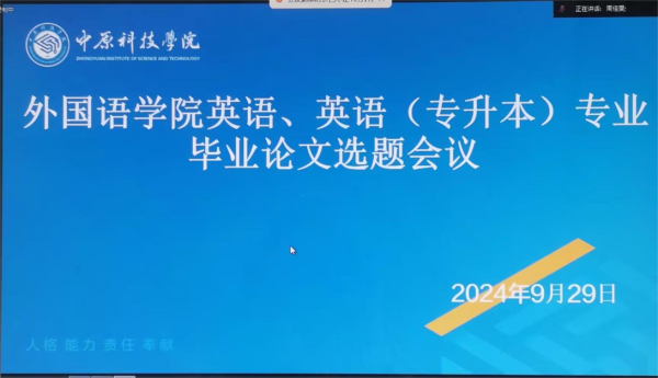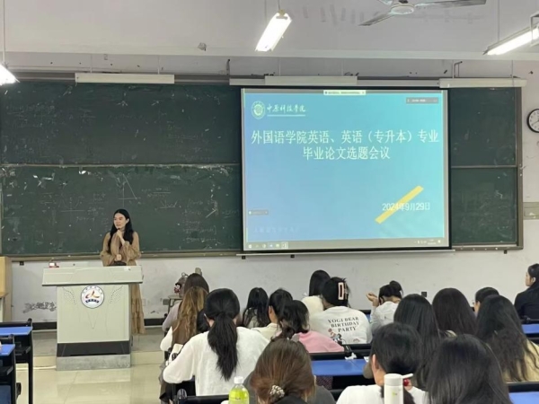 为了确保毕业论文工作的有序进行,外国语学院于2024年9月29日召开了英语、英语(专升本)专业毕业论文选题工作会议,此次会议旨在传达毕业论文选题的基本要求及各选题方向的论文框架,英语、英语(专升本)专业毕业论文全体指导老师及2021级英语专业、2023级英语(专升本)专业全体同学参加了此次会议。