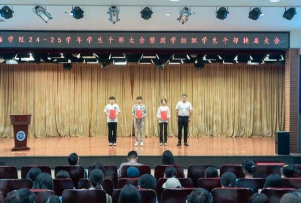 大会在庄严的中华人民共和国国歌声中拉开帷幕。随后,由外国语学院团委副书记刘伟老师宣读外国语学院(郑州校区)2024-2025学年团学组织学生干部任职名单,每一个名字都代表着一份责任与担当。接着,外国语学院党总支副书记张宠老师、学生第一党支部书记吴玉晓老师、学生第二党支部书记李佳老师为团学组织学生干部代表颁发聘书。这份聘书不仅是对他们过去工作的肯定,更是对他们未来工作的期许。
