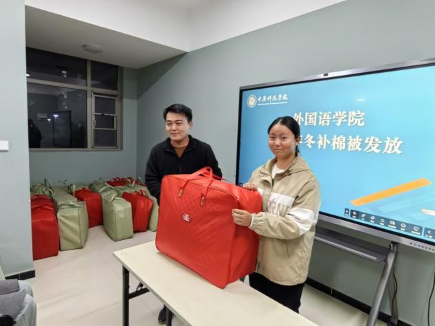 寒冬送温暖,情意满校园。随着冬季的来临,气温逐渐下降,为了确保同学们可以温暖过冬,外国语学院(许昌校区)于2024年11月12日在立心楼E101举行冬季棉被发放活动,用实际行动传递着学校的关爱和温暖。此次活动由外国语学院组织员何明哲老师,辅导员周远航老师共同组织参与。