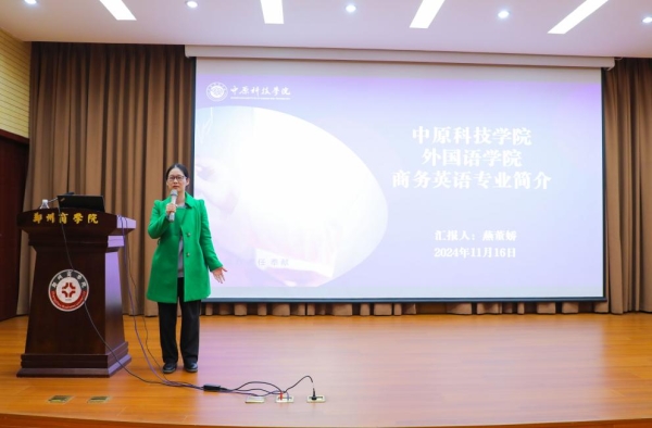 在本次研讨会上,中原科技学院外国语学院商务英语教研室副主任燕董娇在平行论坛发言,聚焦商务英语专业未来发展路径与产教融合的创新模式,燕老师不仅分享了中原科技学院外国语学院在商务英语教学与实践中的宝贵经验,还深入探讨了如何通过加强校企合作、优化课程设置、提升实践教学质量等多方面举措,进一步推动商务英语专业的内涵建设,培养学生的国际视野与创新能力。