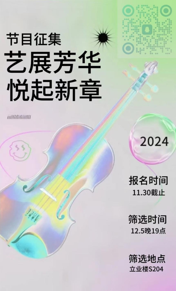 瑞气驱散夜幕,祥光划破黎明。时光匆匆,如白驹过隙,我们即将迈入充满希望与憧憬的崭新一年。在此,面向全体学生热忱招募晚会节目表演者。期望大家以积极乐观的心态与炽热的激情踊跃参与,携手打造一场激动人心、精彩绝伦的视听狂欢!