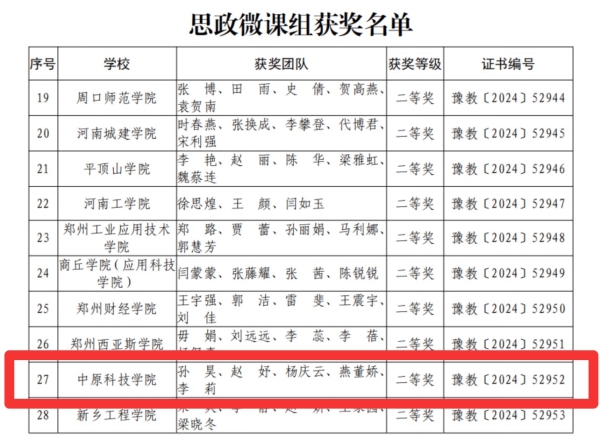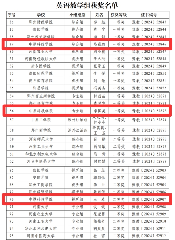 近日,中原科技学院外国语学院在第五届河南省本科高校教师课堂教学创新大赛外语教学赛道暨第十五届全国高校外语教学大赛中,多位教师凭借卓越的教学表现和创新的教学理念,荣获多项大奖,为学院赢得了极高的荣誉,取得了令人瞩目的优异成绩!