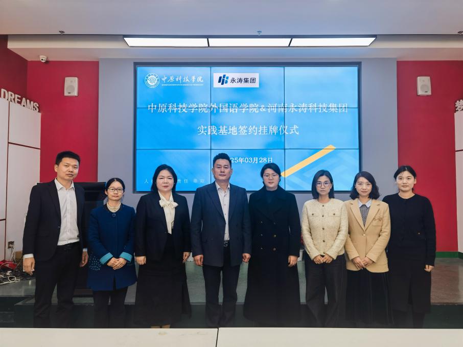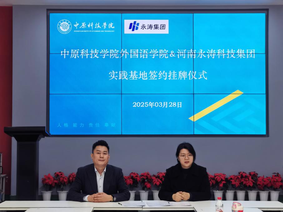 2025年3 月 28 日上午,中原科技学院外国语学院与河南永涛科技集团有限公司实践基地签约挂牌仪式在中原科技学院路演厅隆重举行。仪式由外国语学院院长助理刘华主持,中原科技学院校长助理兼外国语学院副院长赵妤、副院长李莉等校方代表和永涛集团董事长王永涛、总监马朋霞、张东杰等共同出席。