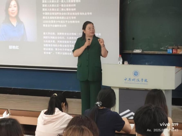 在数字化浪潮与就业市场变革交织的时代背景下,为培育契合时代需求的复合型外语人才,依据2024 版《商务英语专业导论》《西班牙语专业导论》课程教学大纲,外国语学院商务英语专业、西班牙语专业于5月8日联合开展创新教学活动,特邀人社部一级人力资源管理师、人社部一级企业培训师、CCP生涯规划师、向阳生涯BSC职业规划咨询执业导师、中原科技学院企业创业导师胡艳红老师,为2024级学生带来《用语言撬动外语人才全球新前景——AI时代外语专业人才的跨界发展和新机遇》专题教学。