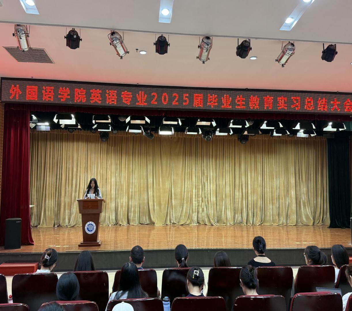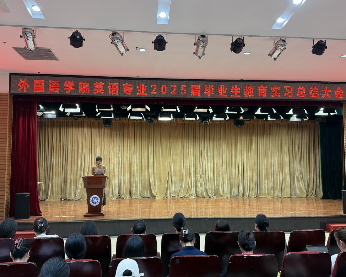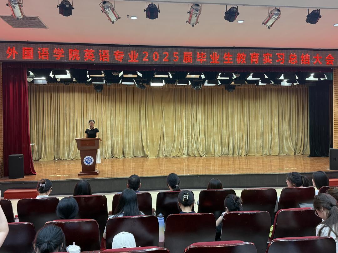 首先,大会由英语专业教研室主任崔晓珂老师致辞,她对全体实习生的辛勤付出和成长进步给予高度肯定,并强调教育实习是师范生培养的关键环节,希望同学们以此次实习为起点,坚守教育初心,不断提升教学能力。