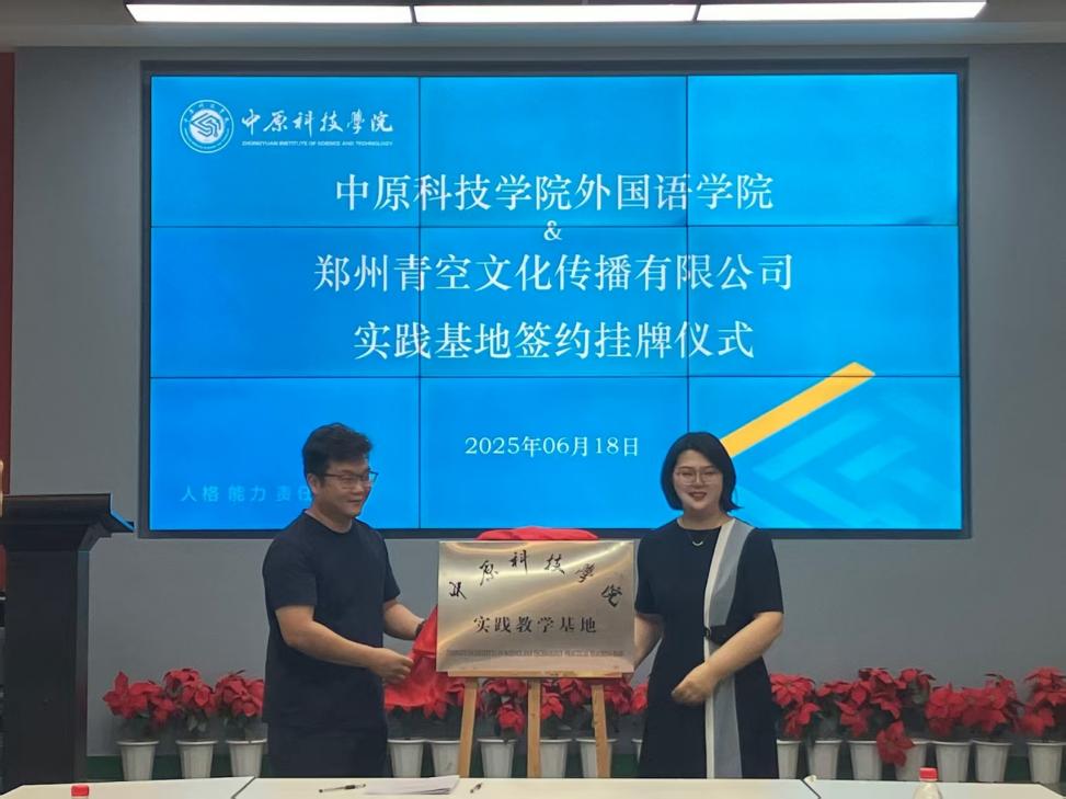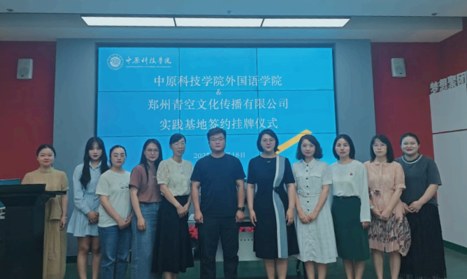 6月18日上午,中原科技学院外国语学院与郑州青空文化传播有限公司实践基地签约挂牌暨捐书仪式在中原科技学院隆重举行。中原科技学院校长助理兼外国语学院副院长赵妤、院长助理刘华等校方代表,与郑州青空文化传播有限公司总经理马宋岭等企业嘉宾共同出席,仪式由院长助理刘华主持。
