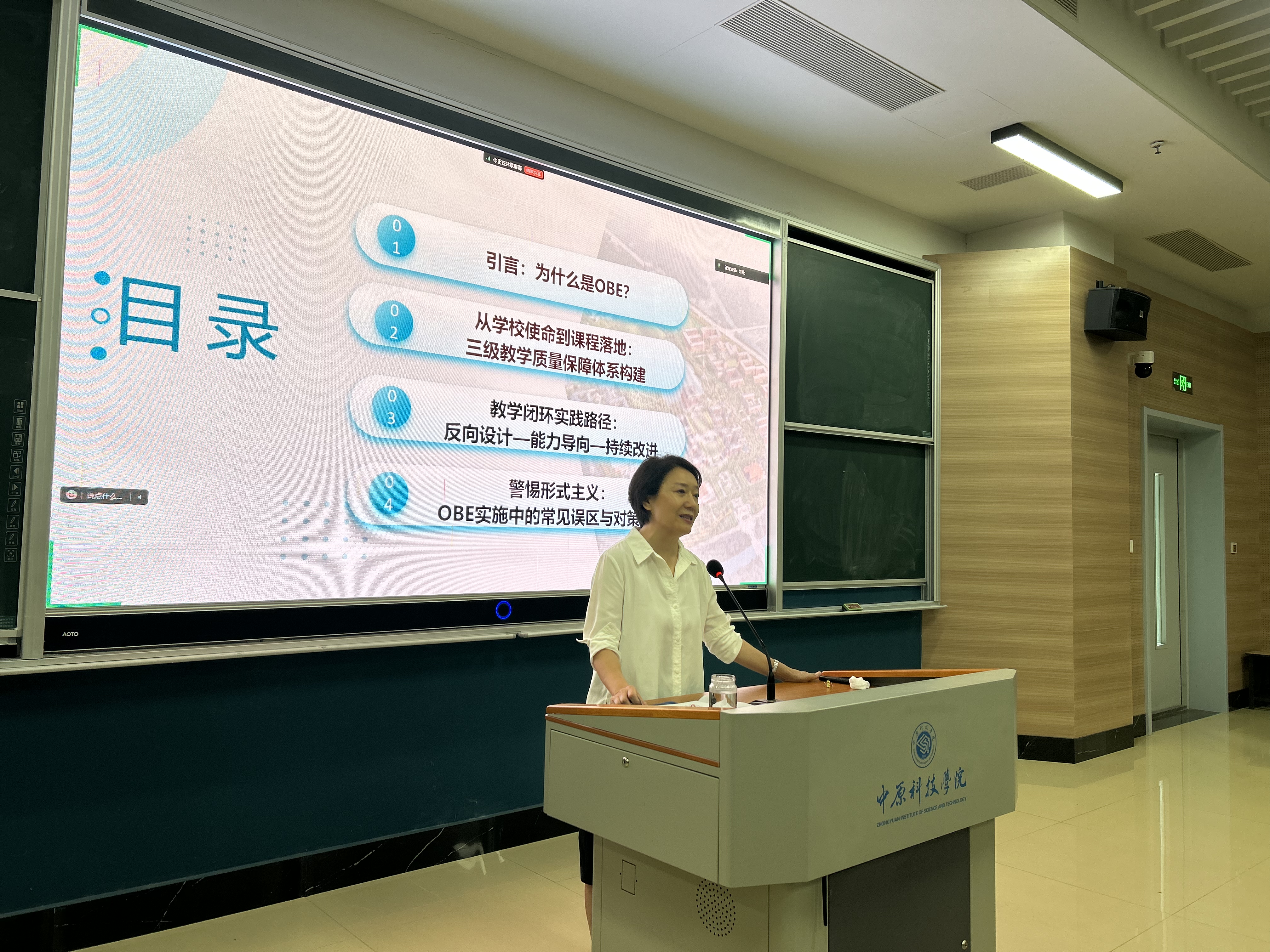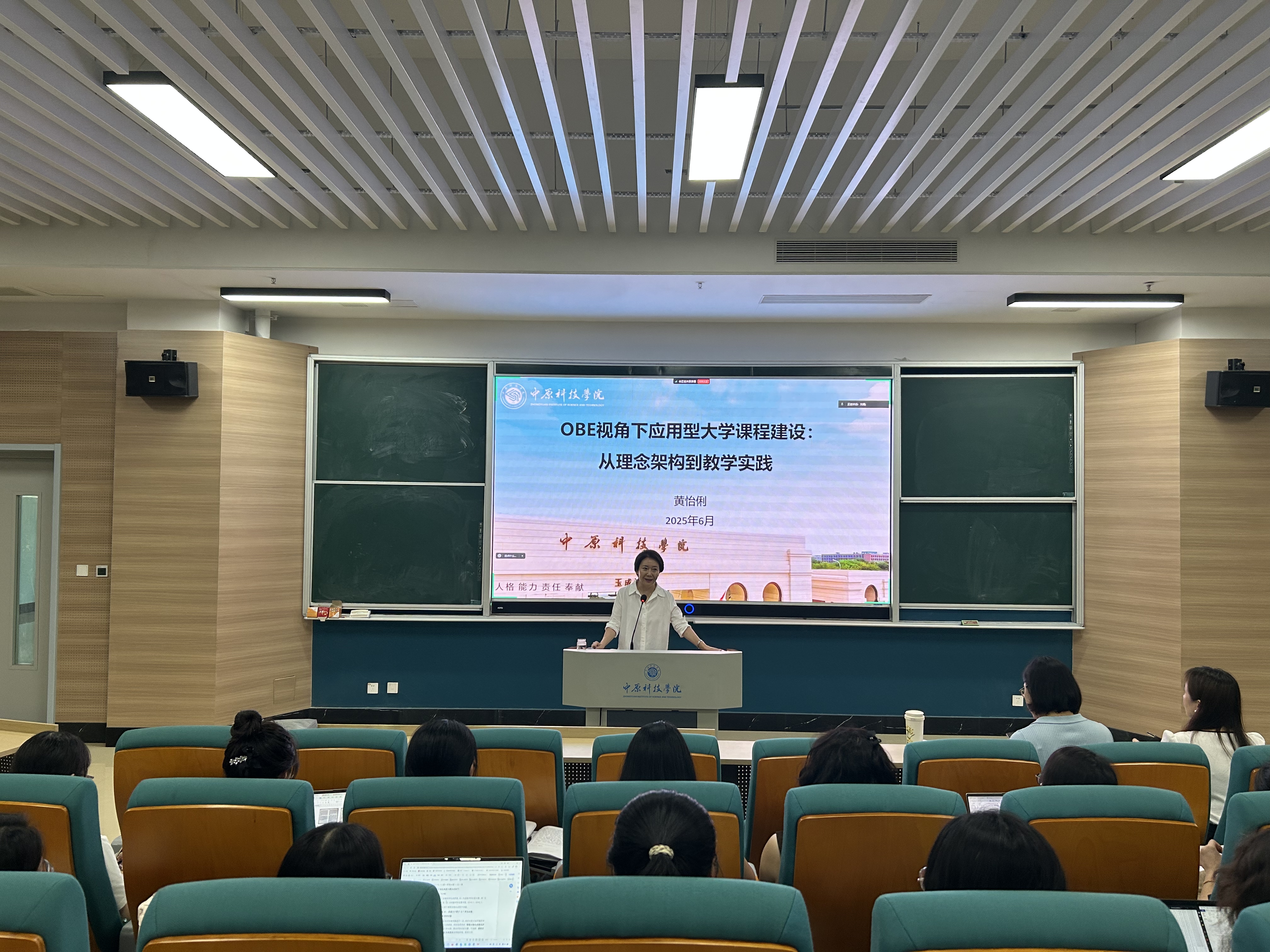6月27日,外国语学院特邀教育部本科教育教学工作评估专家、河南省高等教育学会外语教学研究分会首任理事长黄怡俐,在立业楼S102举办“OBE视角下应用型大学课程建设:从理念架构到教学实践”主题讲座。讲座由外国语学院副院长赵妤主持,外国语学院郑、许两校区教师、部分校外导师及合作基地中学教师同步参会。本次讲座旨在深入贯彻OBE理念,提升学院教学质量与人才培养水平,为专业认证与教学改革赋能。