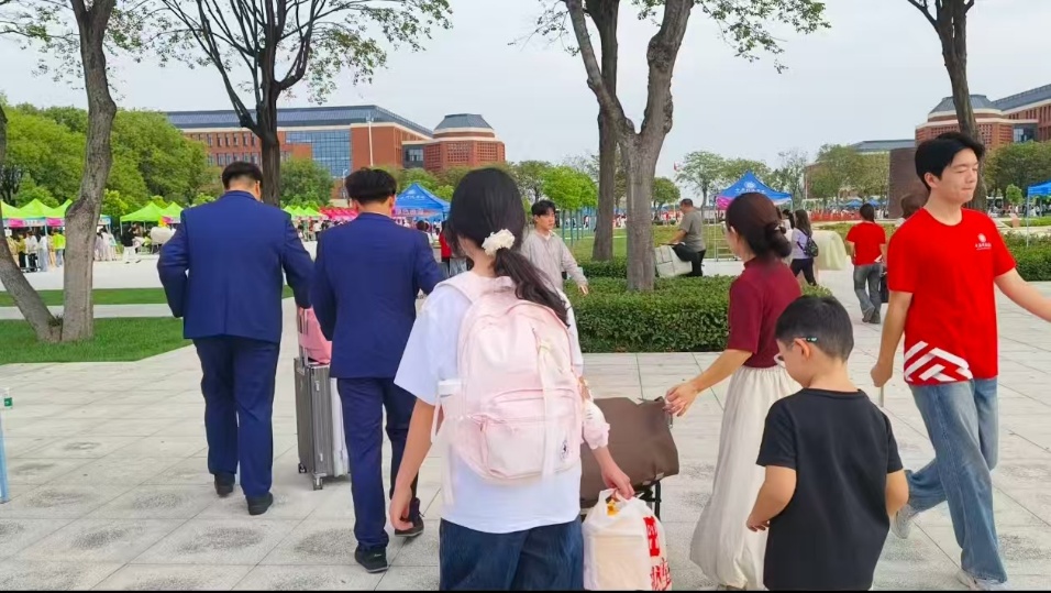 在这场充满活力的迎新季中,由学长组成的"迎新男团"以亮眼表现成为校园焦点,用行动诠释"实力宠新"。黑色墨镜下冷峻的面庞,藏不住眼底跃动的热情;利落的工装造型搭配黑色运动鞋,与躬身搬运行李时的温柔动作形成反差萌,将酷帅外表与暖心服务完美融合。