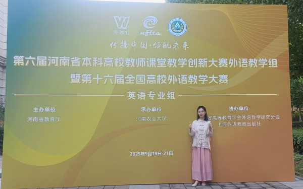 第十六届“外教社杯”全国高校外语教学大赛河南赛区复赛和决赛于9月20日在河南农业大学龙子湖校区举行,来自省内37所高校的优秀教师同台竞技。经过现场授课、说课等环节的激烈角逐,我校外国语学院商务英语教研室教师张妍凭借优秀的表现,荣获英语专业组二等奖。