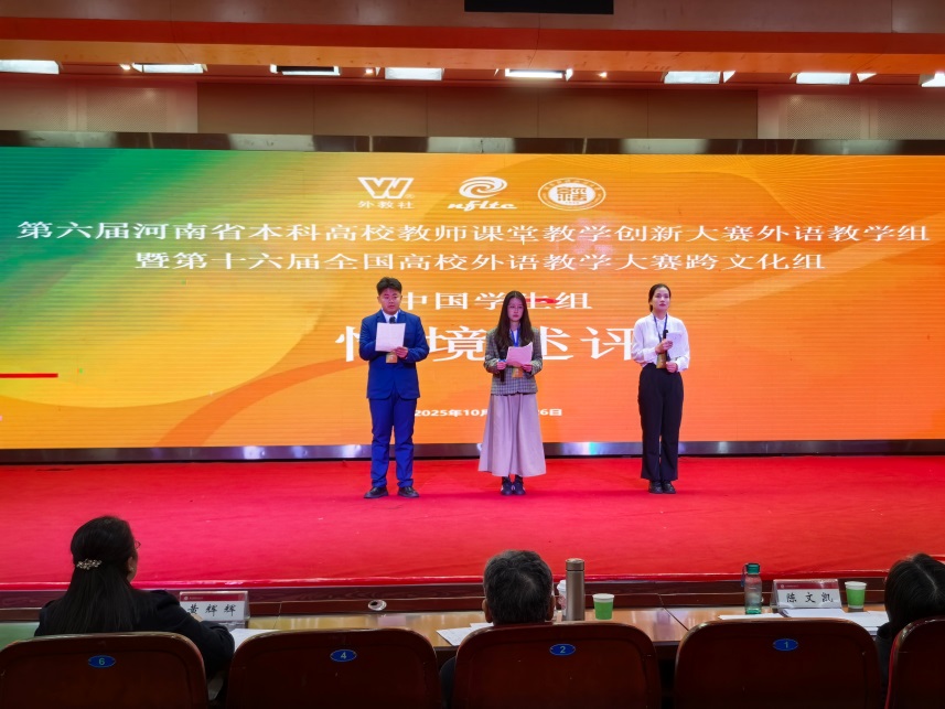 近日,第六届河南省本科高校教师课堂教学创新大赛(外语教学组)暨第十六届全国高校外语教学大赛河南省赛跨文化组比赛圆满落幕。由中原科技学院外国语学院韩淑晴、文学与传媒学院朱登举及刘超凡三位同学组成的参赛团队,在外国语学院杨庆云、王现锐两位老师指导下,凭借着扎实的跨文化知识、出色的现场展示能力及参赛团队的默契协作,经省赛复赛与决赛考验,斩获省级一等奖。