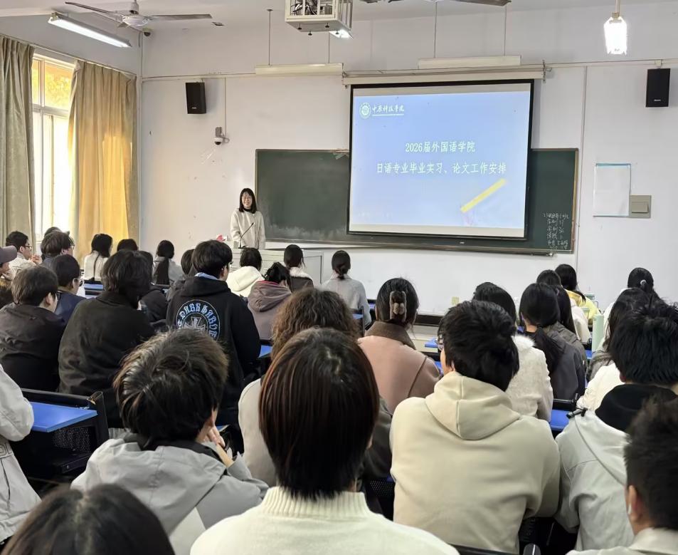 为切实做好毕业生实践教学与学术指导工作,外国语学院日语教研室于2025年11月3日在日新408召开了2026届日语专业毕业实习与毕业论文工作安排会议。日语教研室白璐老师、卢静老师、刘强老师以及2026届日语专业全体毕业生共同参加了此会议。会议围绕毕业实习安排、论文选题方向、时间节点及注意事项进行了详细说明,为学生顺利毕业奠定坚实基础。